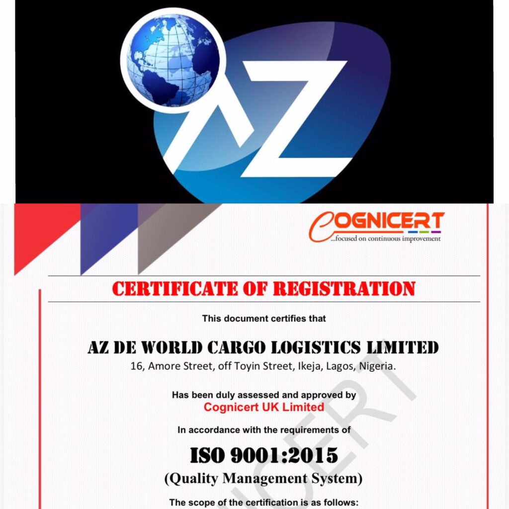 AZ DE WORLD CARGO LOGISTICS LIMITED has set a new quality benchmark in Nigeria’s maritime and logistics sector following its successful certification under the ISO 9001:2015 Quality Management System (QMS) standard.