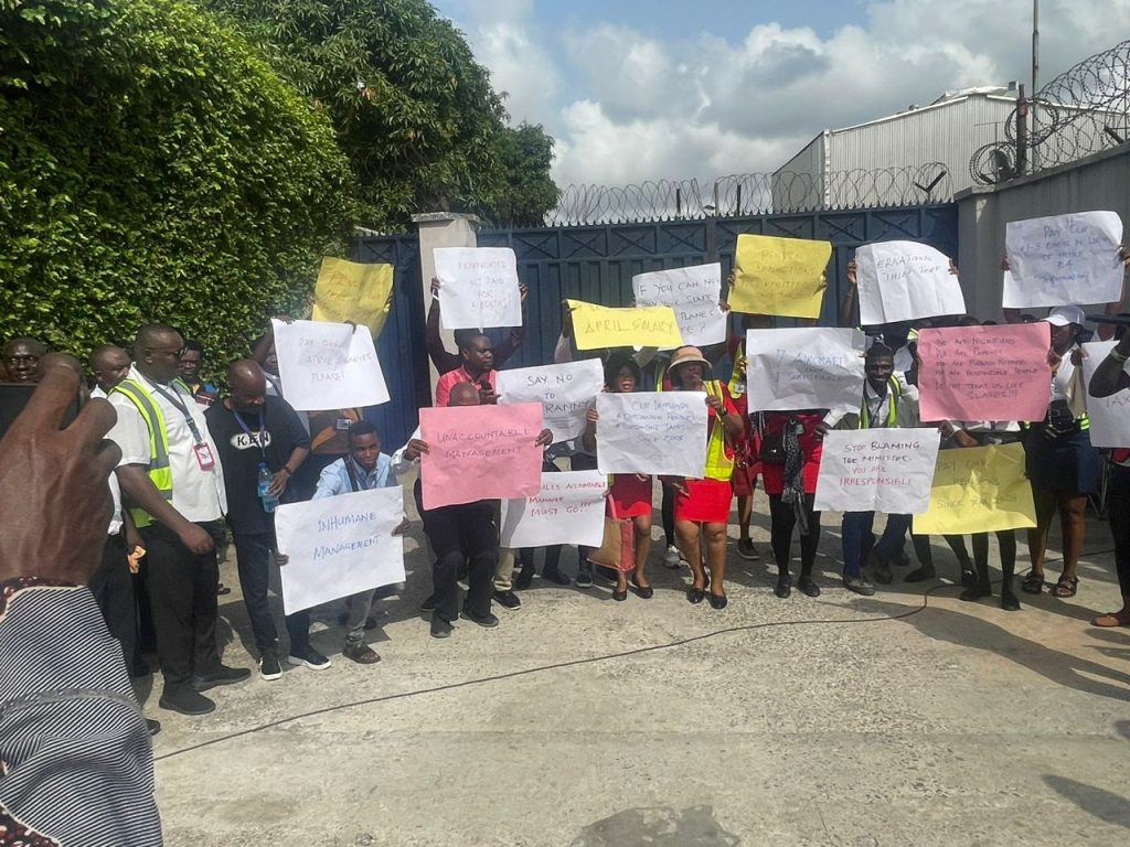 The protesters displayed various placards with inscriptions; “Please pay us our April salary;” Say No to Tyranny;” ‘If you cannot pay your staff, are your planes safe?” among others.