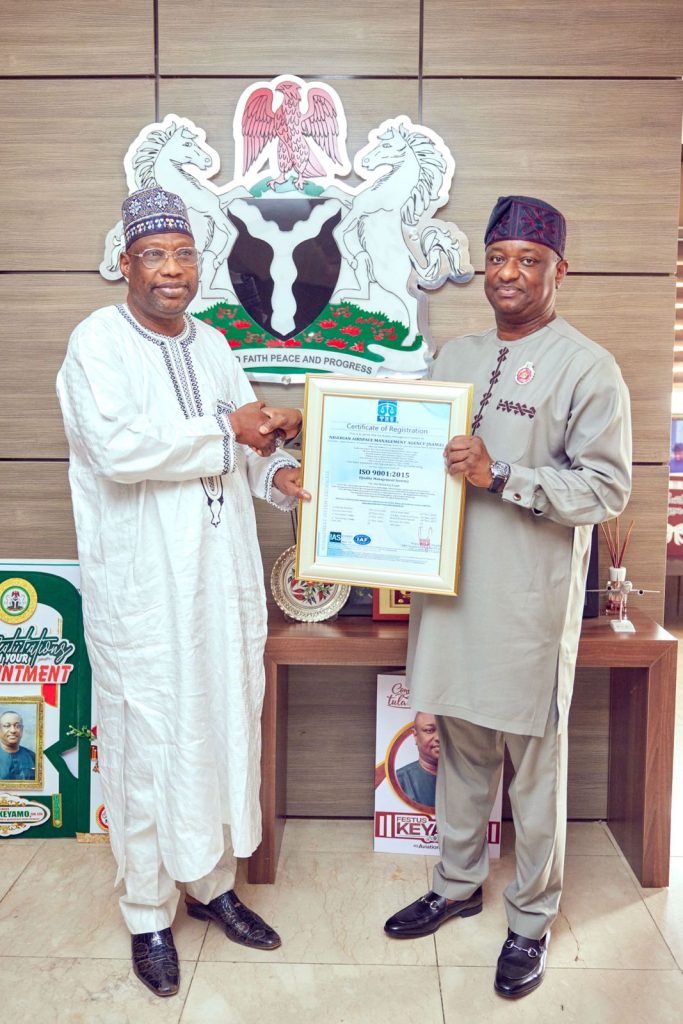 Keyamo made the commendation in a significant ceremony held in Abuja, where the NAMA Managing Director led other top management staff to present the prestigious ISO 9001 certification to the Minister, a testament to the Agency’s adherence to global best practices and its robust Quality Management System.