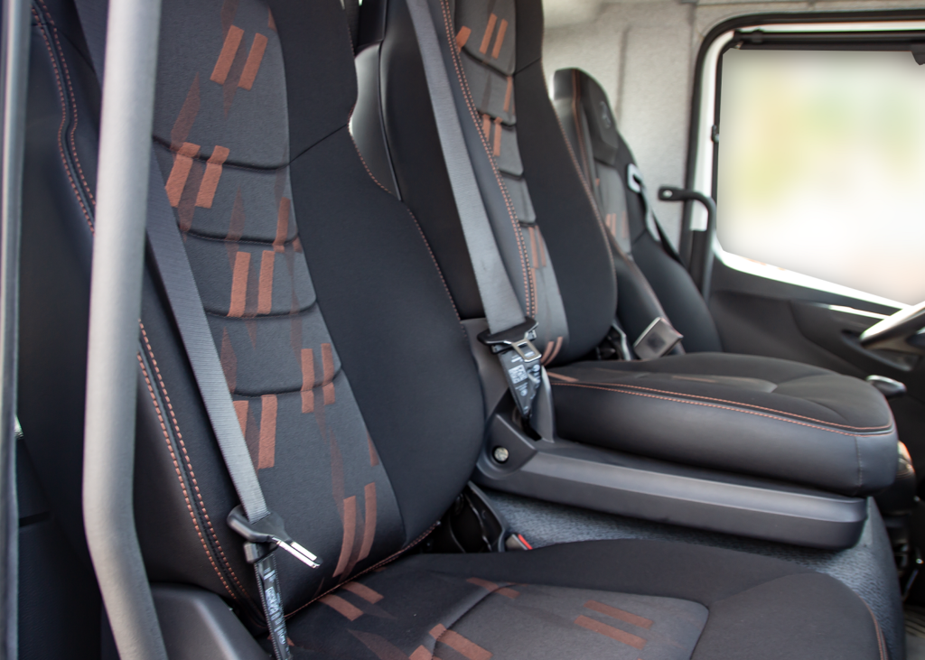 The interior design of the Mercedes-Benz Atego distribution truck takes a practical and functional approach with ample space for the driver and an extra two passengers in the cab.
