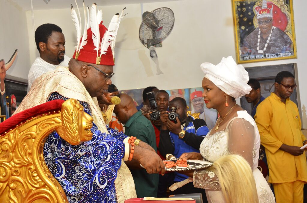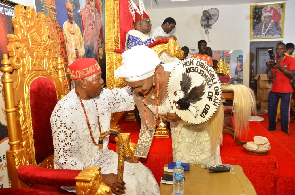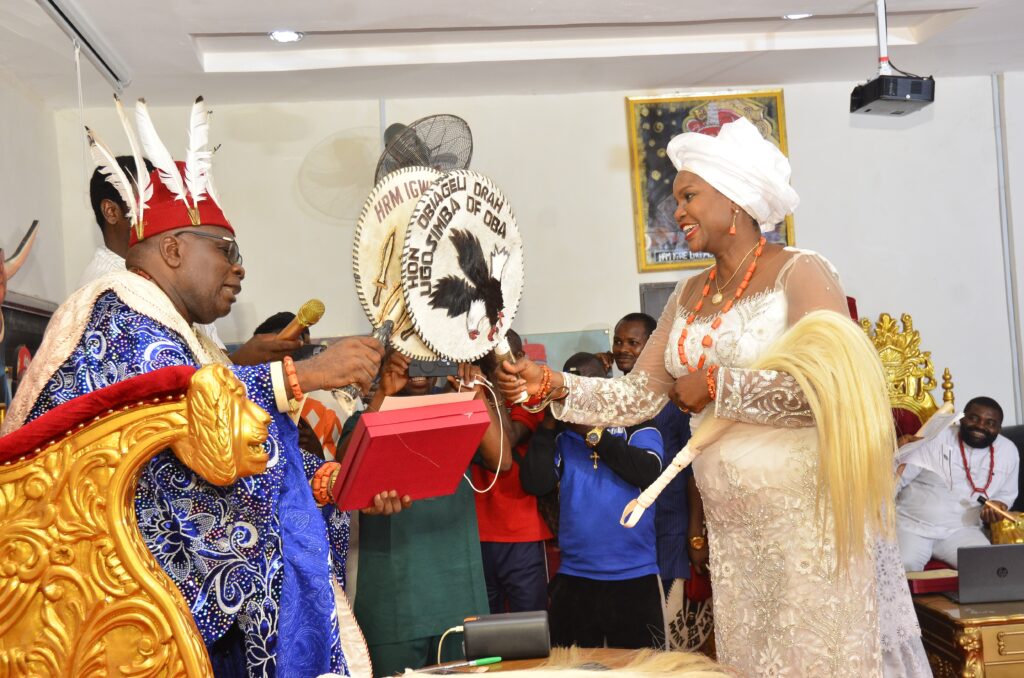 Mrs. Orah was installed as Chief Ugosimba and Lolo Nmaluluno of Oba Kingdom, while her husband received the title Ichie Okokpa I of Oba Kingdom.