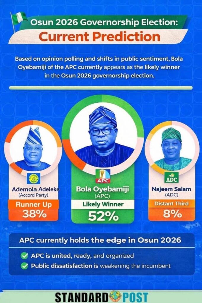A new opinion poll conducted by reputable media organisation Standard Post has projected victory for the All Progressives Congress (APC) governorship candidate, Asiwaju Munirudeen Bola Oyebamiji (AMBO), in the August 8, 2026 Osun State governorship election.