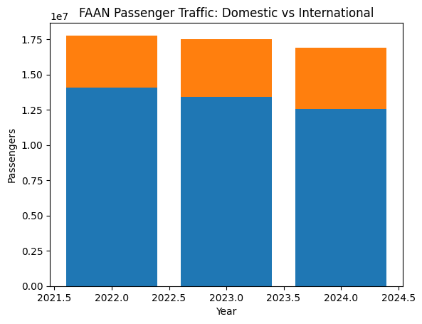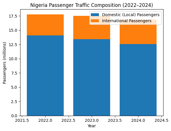 In 2022, domestic flights carried 14.06 million passengers, compared to 3.71 million international travellers. By 2024, domestic passenger traffic had fallen to 12.54 million, while international traffic rose to 4.33 million, lifting international travel’s share of total passenger movements from about 21 per cent to nearly 26 per cent.
