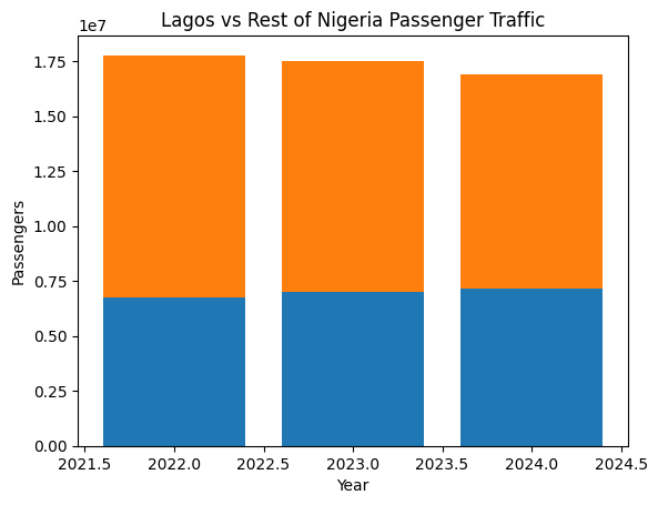 Airport-by-airport figures revealed a widening concentration of passenger traffic. Lagos and Abuja airports together accounted for nearly three-quarters of all passenger movements in 2024, up from just under 73 per cent in 2022. Lagos alone handled over 42 per cent of total national passenger traffic in 2024, reinforcing its dominance in Nigeria’s aviation network.