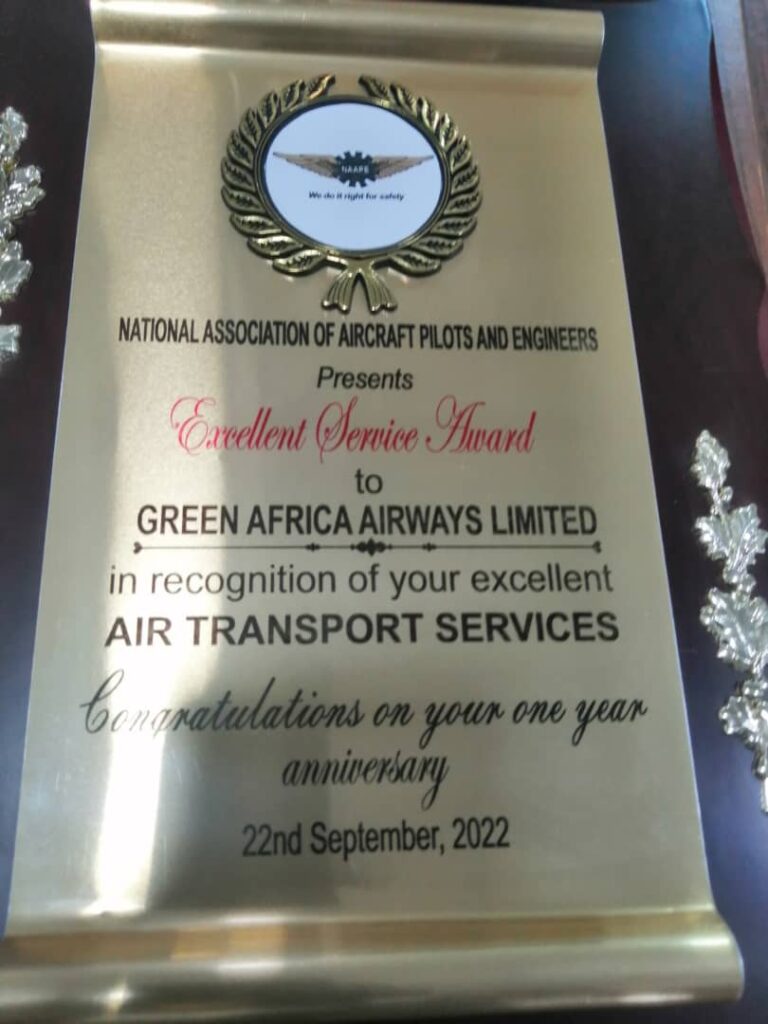 The association has also presented an ‘Excellence Service Award’ to Green Africa Airways for its excellent service delivery since it commenced flight services about a year ago.